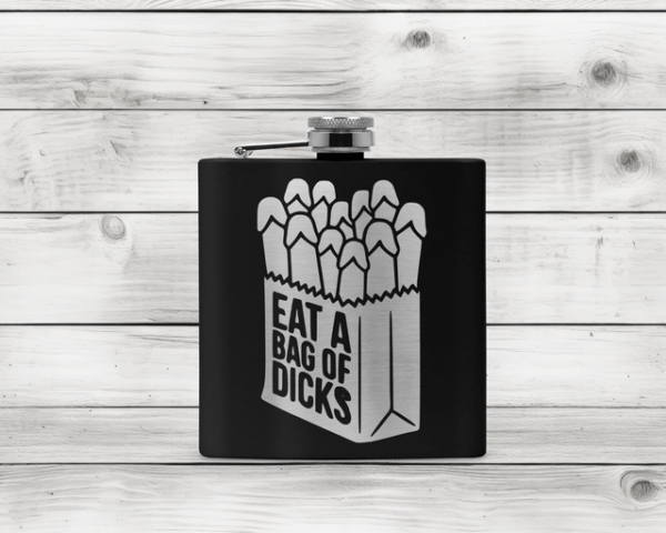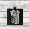 Laser engraved 8oz matte black flask with funnel. Flask is approximately 5.4″x3.8″.