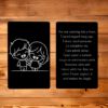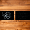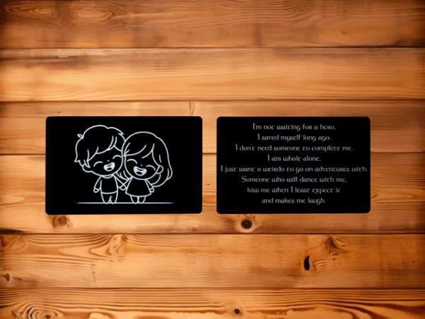 Laser engraved metal card is  approximately 3″x2.5″. The size of a standard business card and will easily fit in a wallet, purse, etc.