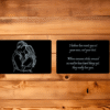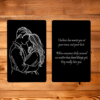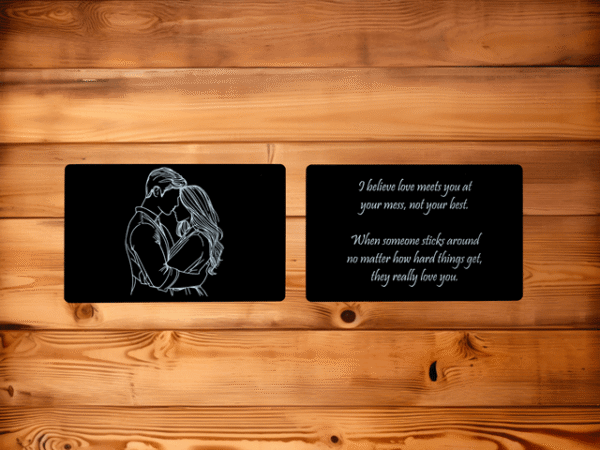 Laser engraved metal card is  approximately 3″x2.5″. The size of a standard business card and will easily fit in a wallet, purse, etc.