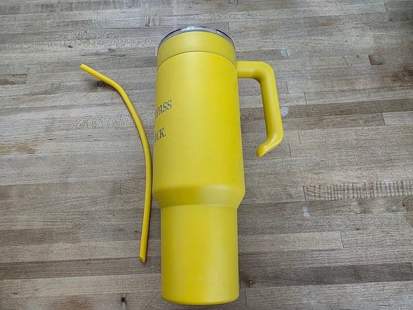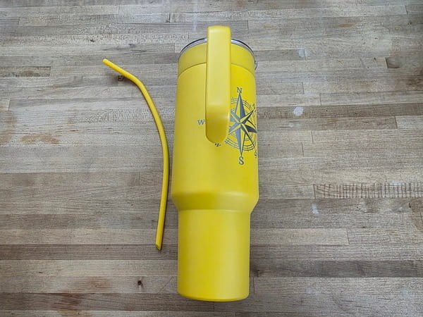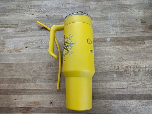 40oz insulated tumbler with lid, removable handle, and silicone straw. Great for hot or cold drinks and easy to carry or fit in cup holders.